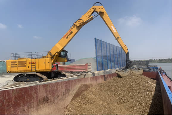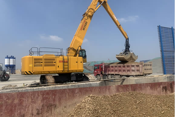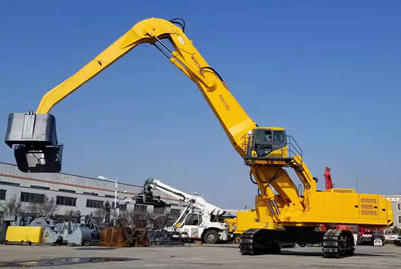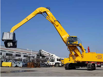 該設備分別采用了大功率“國三”標準發動機、380V 西門子電機,以及全套采用施耐德控制系統拖動控制兩套力士樂液壓動力機構及先導液力控制的世界首臺“雙動力”抓料機。該機設計了寬體結構梁,以及加強型可更換正、負差的二節式作業主臂,最大吊重量達 25 噸、最大作業半徑為 18米。在 5 至 12 米作業半徑內,可配備 5.0 立方蚌殼抓斗,或 2.5 立方梅花廢鋼抓斗。